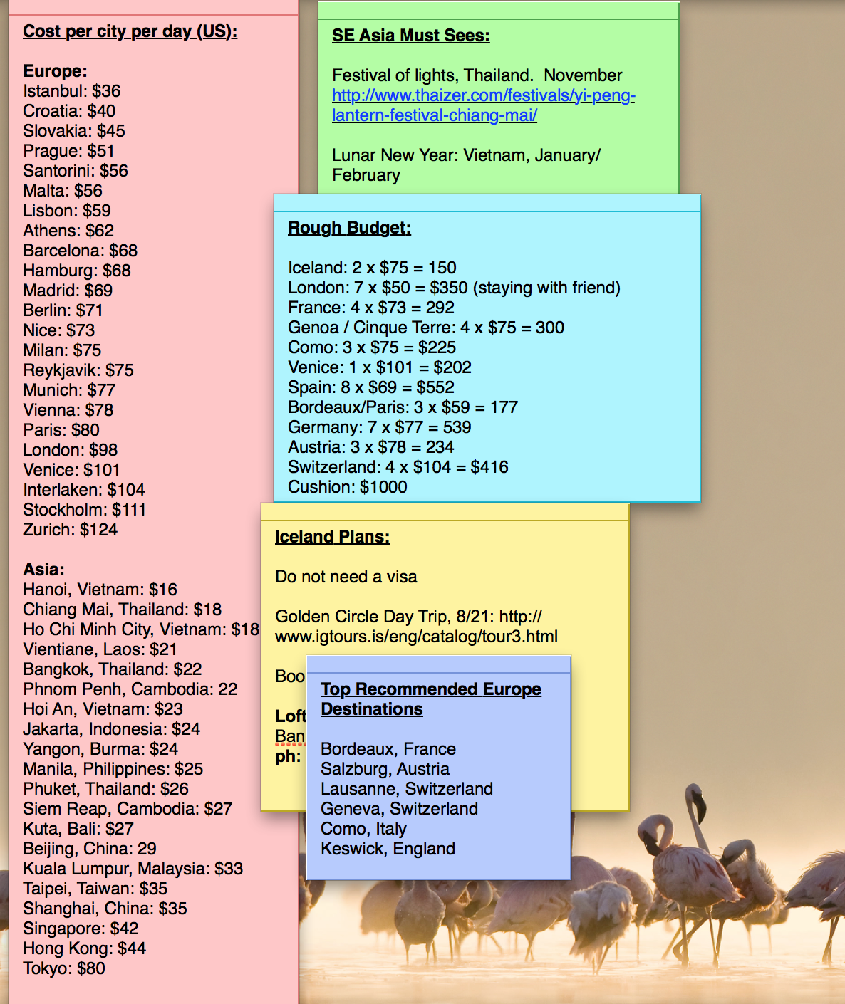 • Making a rough budget: I originally put this down below under “Emotional Prep”… whatever it is, it’s obviously really important to know what the typical costs in each location are.  It hurts though.