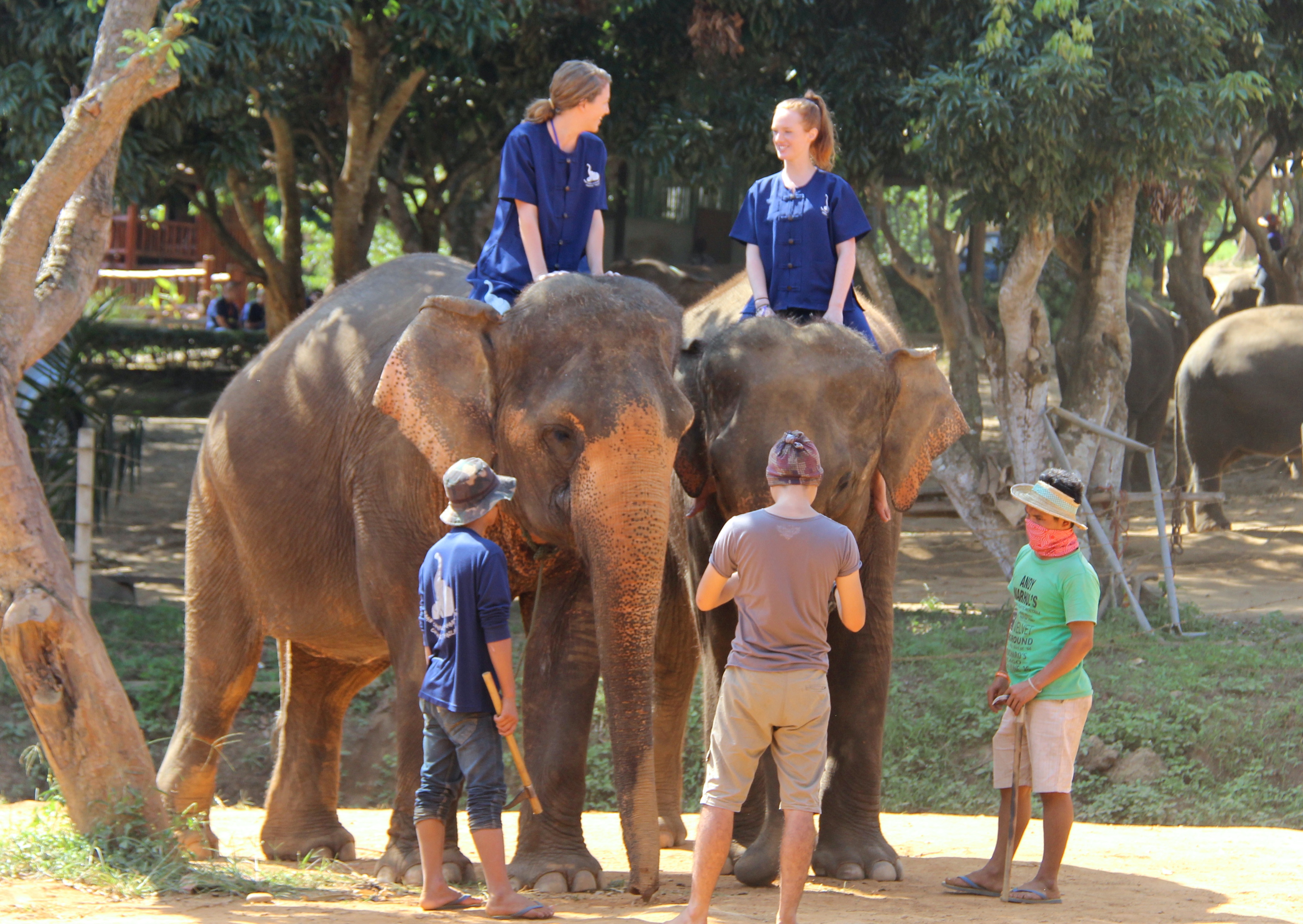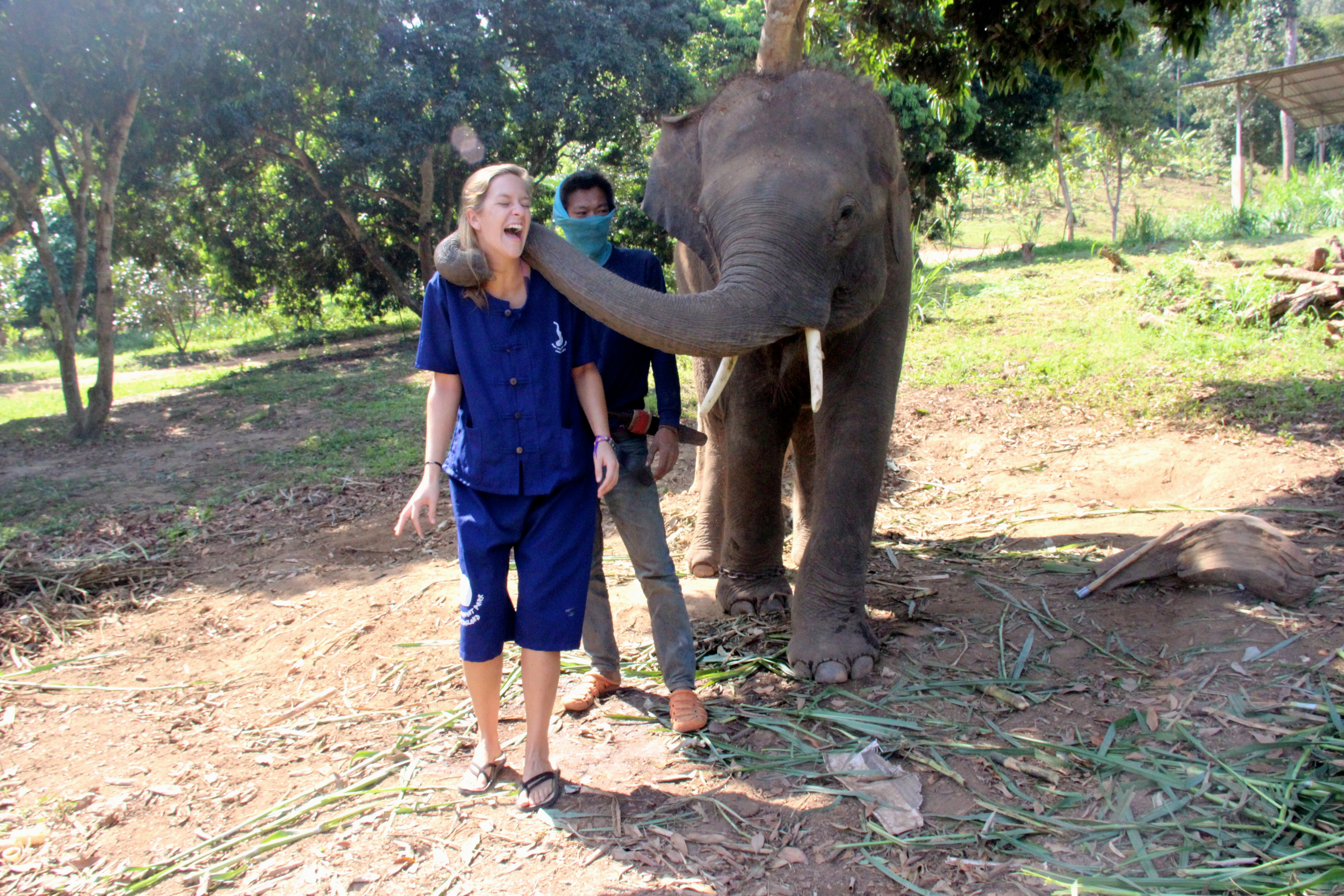 IMG_6676Once we arrived at the park, our guide handed us each uniforms – a navy blue shirt and navy blue shorts (more like shants).  We looked like escaped convicts, but the uniform offered both function for us guests and familiarity for the elephants.  Once in our costumes, we were taken out to the field to familiarize ourselves with these giant creatures.  Entering the park, there were elephants stationed every meter or two and, the second you paid attention to anything other than where you were positioned, you’d see a trunk inches from your head.   It was surreal.  We were taught how to feed the elephants bananas (or more like how to hold them so they can take them from us and throw them in their own mouths), which was surprisingly entertaining.
