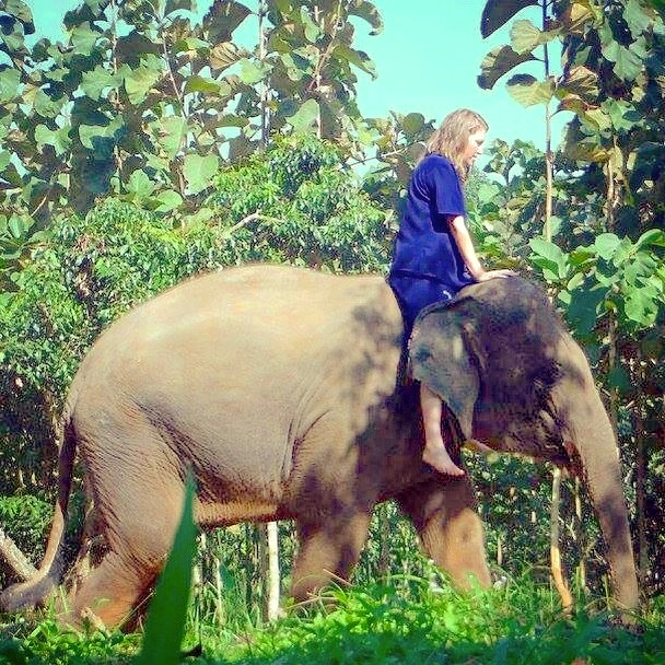 IMG_6863After learning all about the elephants, we were taught how to ride on them.  The way it was done is considered humane, as were no baskets causing harm to their spines.  We rode on the elephant’s neck instead.  Regardless of the lessons given, the strangest moment of the entire day was when our mahout said “Ok, now get up on the elephant.”  It wasn’t as hard as I expected.  The elephant bowed down, I stepped on it’s leg to hoist myself up on its neck.  I held its ears for balance and when the elephant stood up fully as I was sitting on him, it was pretty damn scary.